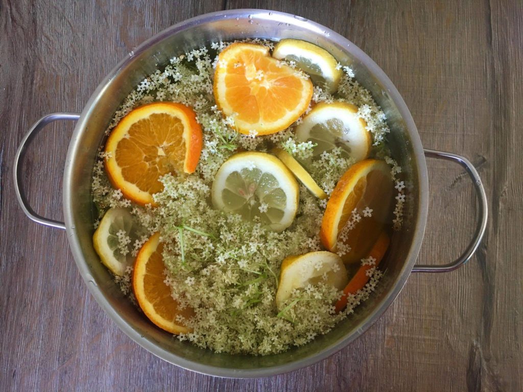 Cueillir les ombelles soigneusement, vérifier qu’elles ne soient pas habitées par des petites bêtes. Ne pas les laver car leur saveur s’en irait. Placer dans une grande casserole : l’eau, les ombelles de sureau et les agrumes coupés en rondelles. Recouvrir d’un linge fin et laisser reposer 2 jours. Ensuite filtrer le tout, et porter brièvement à ébullition l’eau de sureau ainsi récoltée et le sucre. Dès que le sucre s’est dissous, remplir vos bouteilles stérilisées avec votre préparation.
